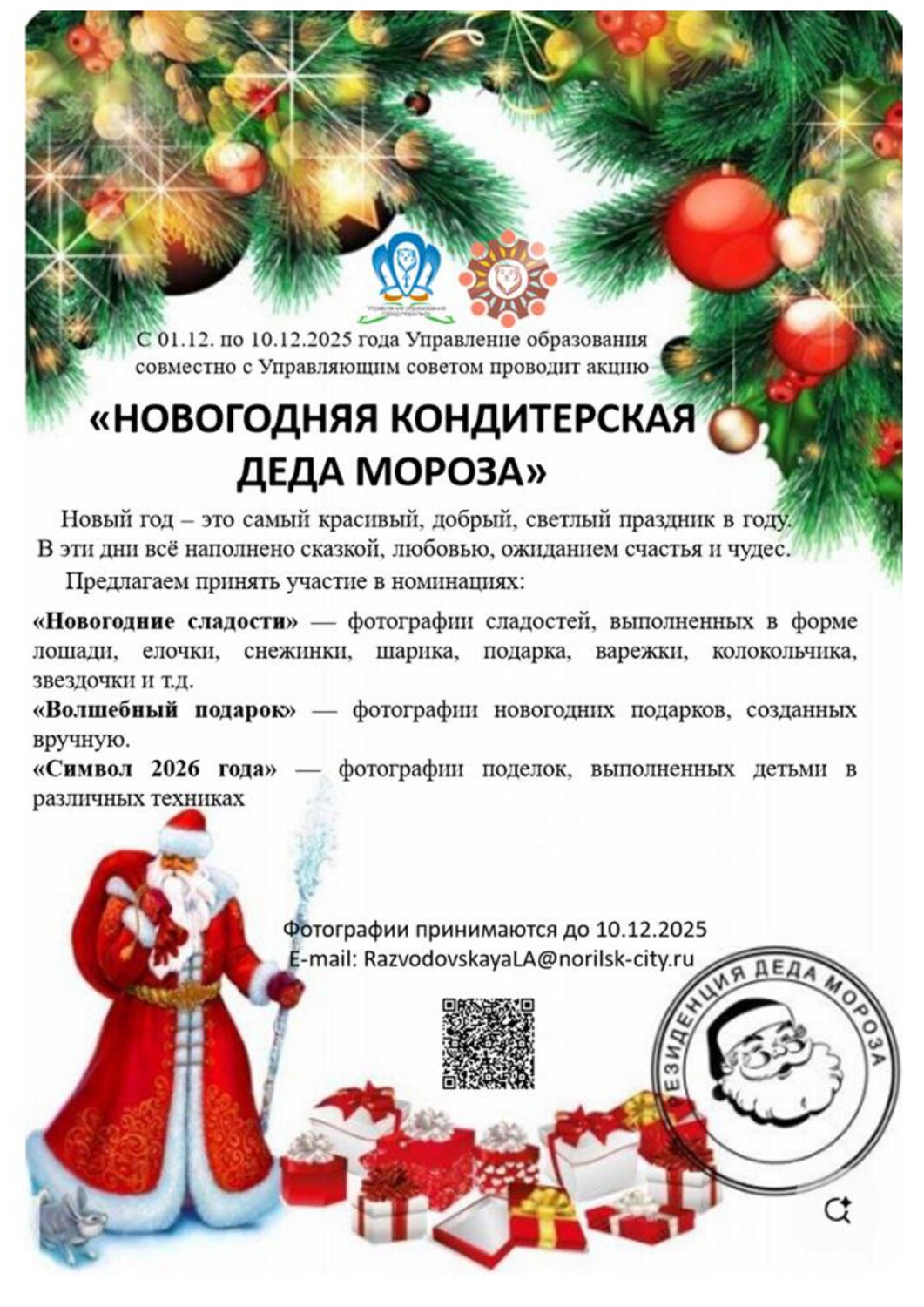 С 01.12.2025 по 10.12.2025 года Управление общего и дошкольного образования Администрация города Норильска (далее – Управление) совместно с Управляющим советом по образованию муниципального образования город Норильск (далее – УС) организует фотоакцию «Новогодняя кондитерская Деда Мороза».